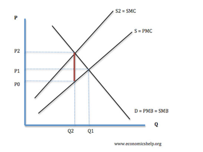 Another possible solution is the carbon tax. The purpose of a carbon tax is to internalise the externality. What this means is that the final price of the good should include the external cost and not just the private cost. It is similar to the ‘polluter pays principle.