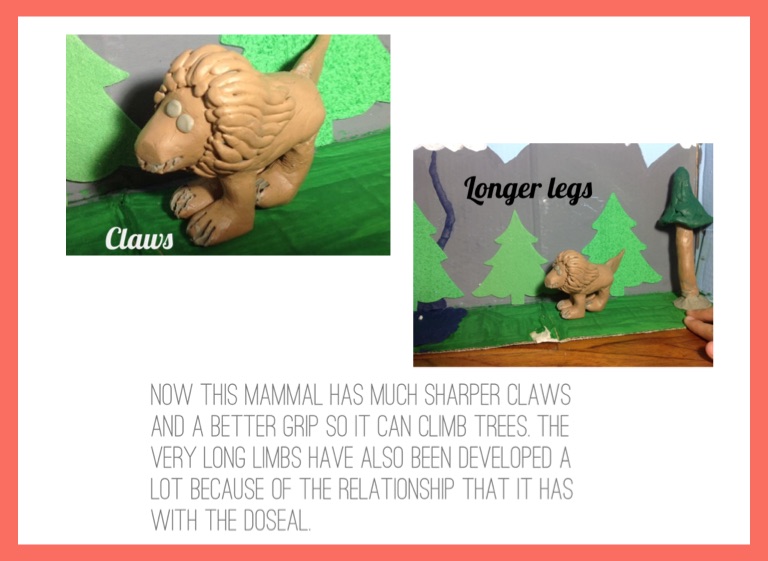 Now this mammal has much sharper claws and a better grip so it can climb trees. The very long limbs have also been developed a lot because of the relationship that it has with the doseal.