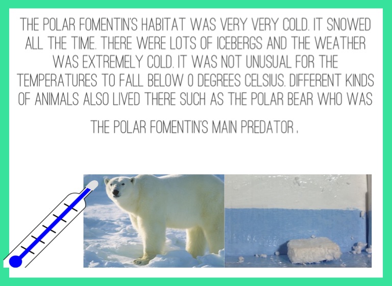 The polar fomentin's habitat was very very cold. It snowed ALL the time. There were lots of icebergs and the weather was extremely cold. It was not unusual for the temperatures to fall below 0 degrees Celsius. Different kinds of animals also lived there such as the polar bear who was the polar fomentin's main predator.