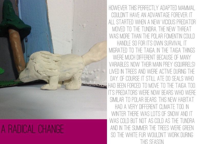 However this perfectly adapted mammal couldn't have an advantage forever. It all started when a new vicious predator moved to the tundra. The new threat was more than the polar fomentin could handle so for its own survival it migrated to the taiga. In the taiga things were much different because of many variables. Now their main prey (squirrels) lived in trees and were active during the day. Of course it still ate do seals who had been forced to move to the taiga too. It's predators were now bears who were similar to polar bears. This new habitat had a very different climate too. In winter there was lots of snow and it was cold but not as cold as the tundra and in the summer the trees were green so the white fur wouldn't work during this season.