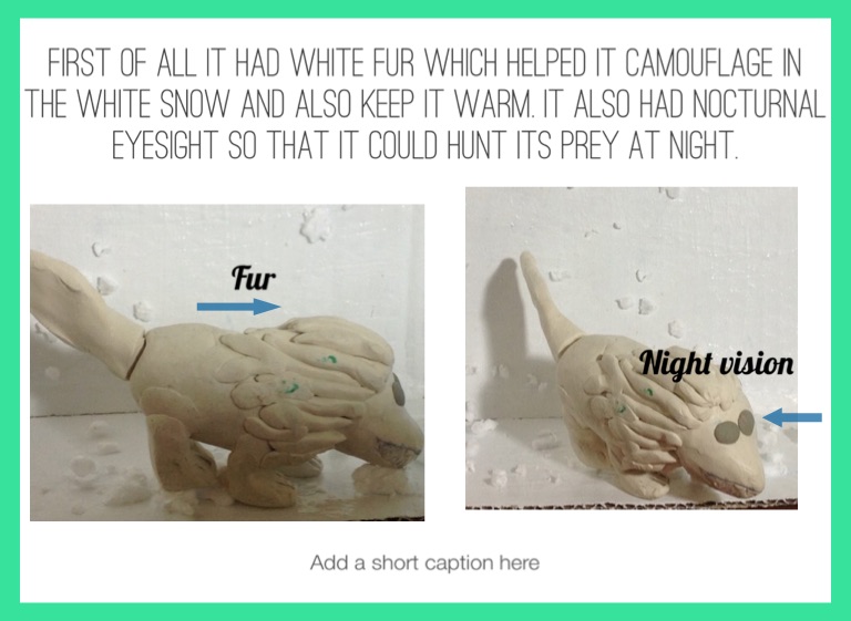 First of all it had white fur which helped it camouflage in the white Snow and also keep it warm. It also had nocturnal eyesight so that it could hunt its prey at night.