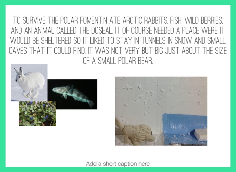 To survive the polar fomentin ate arctic rabbits, fish, wild berries, and an animal called the doseal. It of course needed a place were it would be sheltered so it liked to stay in tunnels in snow and small caves that it could find. It was not very but big just about the size of a small polar bear.