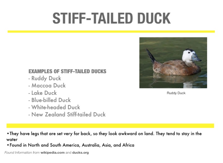 •Called the Stiff-Tailed Duck because it has long, stiff tail feathers