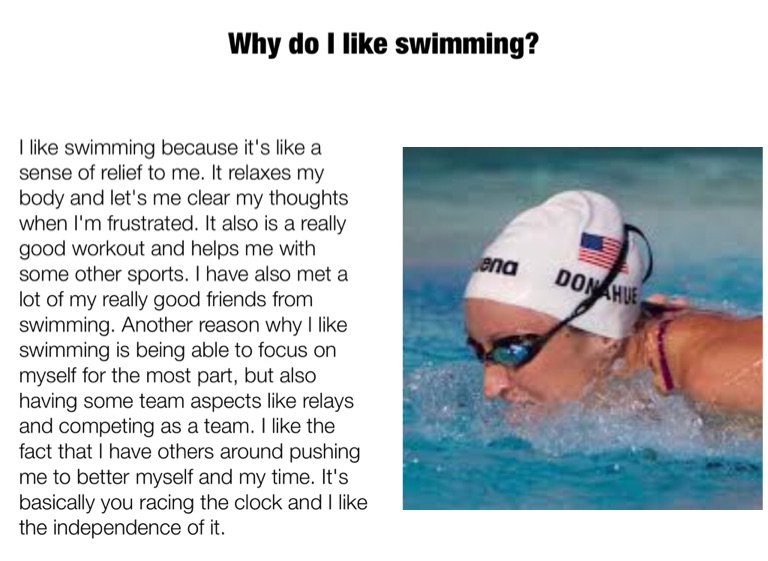 I like swimming because it's like a sense of relief to me. It relaxes my body and let's me clear my thoughts when I'm frustrated. It also is a really good workout and helps me with some other sports. I have also met a lot of my really good friends from swimming. Another reason why I like swimming is being able to focus on myself for the most part, but also having some team aspects like relays and competing as a team. I like the fact that I have others around pushing me to better myself and my time. It's basically you racing the clock and I like the independence of it.