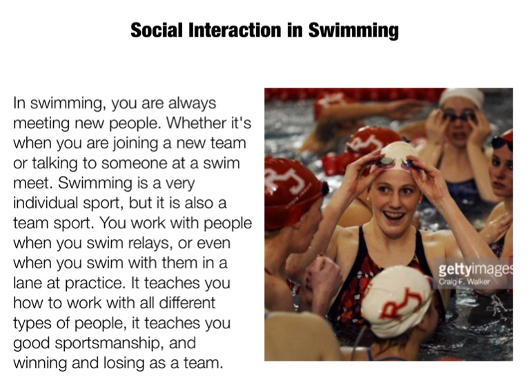 In swimming, you are always meeting new people. Whether it's when you are joining a new team or talking to someone at a swim meet. Swimming is a very individual sport, but it is also a team sport. You work with people when you swim relays, or even when you swim with them in a lane at practice. It teaches you how to work with all different types of people, it teaches you good sportsmanship, and winning and losing as a team.