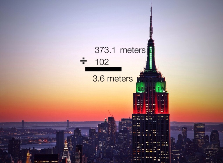 If the Empire State Building is 373.1 meters high, and it has 102 floors, how many meters high is each floor? Round your answer to the nearest tenth.