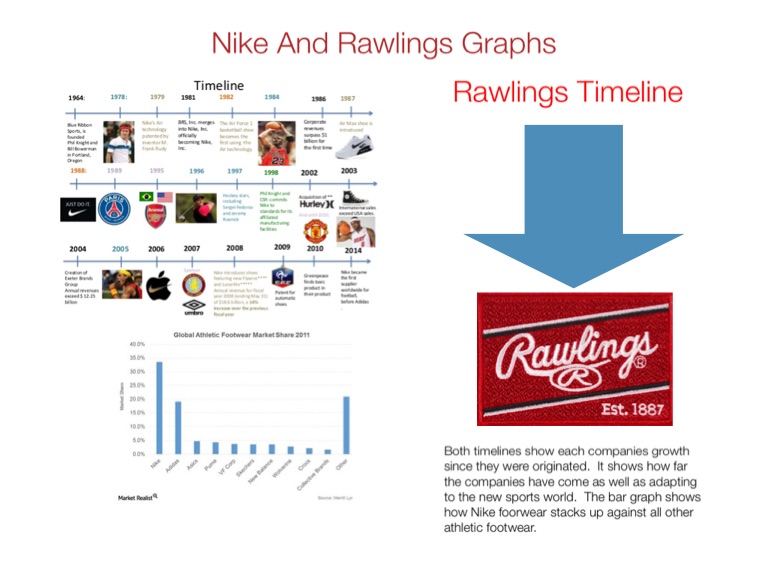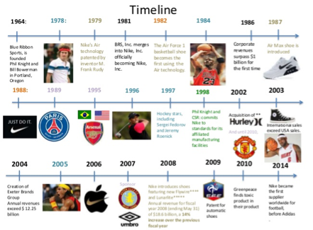 Both timelines show each companies growth since they were originated. It shows how far the companies have come as well as adapting to the new sports world. The bar graph shows how Nike foorwear stacks up against all other athletic footwear.