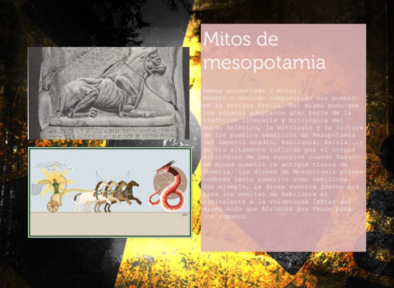Homero o Hesiodo compusieran sus poemas en la antigua Grecia. Del mismo modo que los romanos adoptaron gran parte de la tradición literaria y mitológica del mundo helénico, la mitología y la cultura de los pueblos semíticos de Mesopotamia (el imperio acadio, Babilonia, Asiria...) se vio altamente influida por el corpus mitológico de los sumerios cuando Sargón de Accad sometió la antigua tierra de Sumeria. los dioses de Mesopotamia poseen nombres tanto sumerios como semíticos. Por ejemplo, la diosa sumeria Inanna era para los semitas de Babilonia el equivalente a la voluptuosa Ishtar del mismo modo que Afrodita era Venus para los romanos.