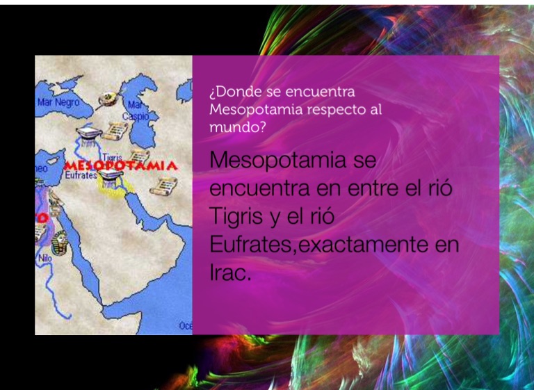 Mesopotamia se encuentra en entre el rió Tigris y el rió Eufrates,exactamente en Irac.