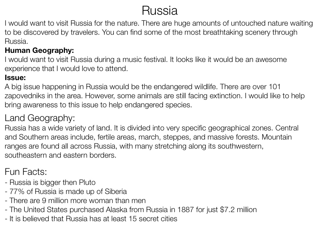 I would want to visit Russia for the nature. There are huge amounts of untouched nature waiting to be discovered by travelers. You can find some of the most breathtaking scenery through Russia.