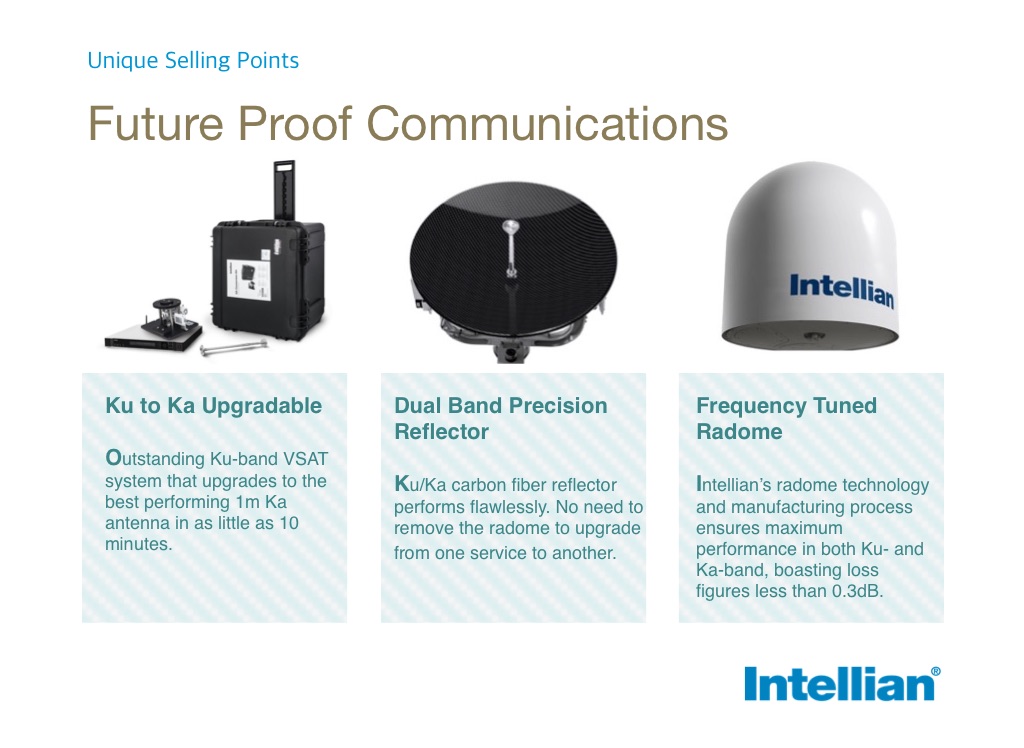 Intellian’s radome technology and manufacturing process ensures maximum performance in both Ku- and Ka-band, boasting loss figures less than 0.3dB.