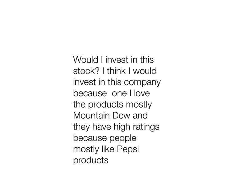 Would I invest in this stock? I think I would invest in this company because one I love the products mostly Mountain Dew and they have high ratings because people mostly like Pepsi products
