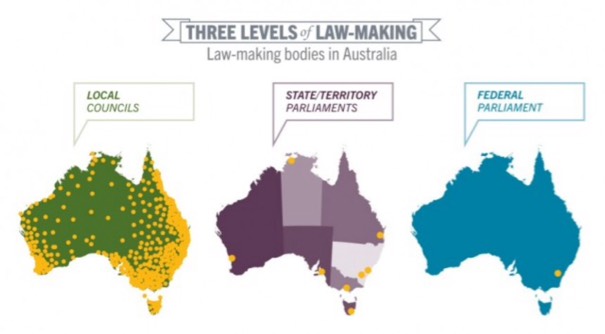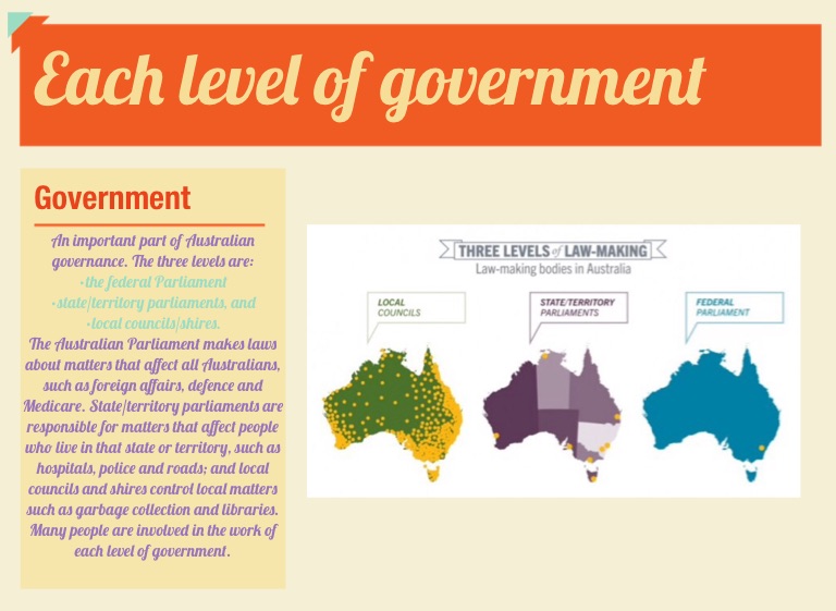 The Australian Parliament makes laws about matters that affect all Australians, such as foreign affairs, defence and Medicare. State/territory parliaments are responsible for matters that affect people who live in that state or territory, such as hospitals, police and roads; and local councils and shires control local matters such as garbage collection and libraries. Many people are involved in the work of each level of government.