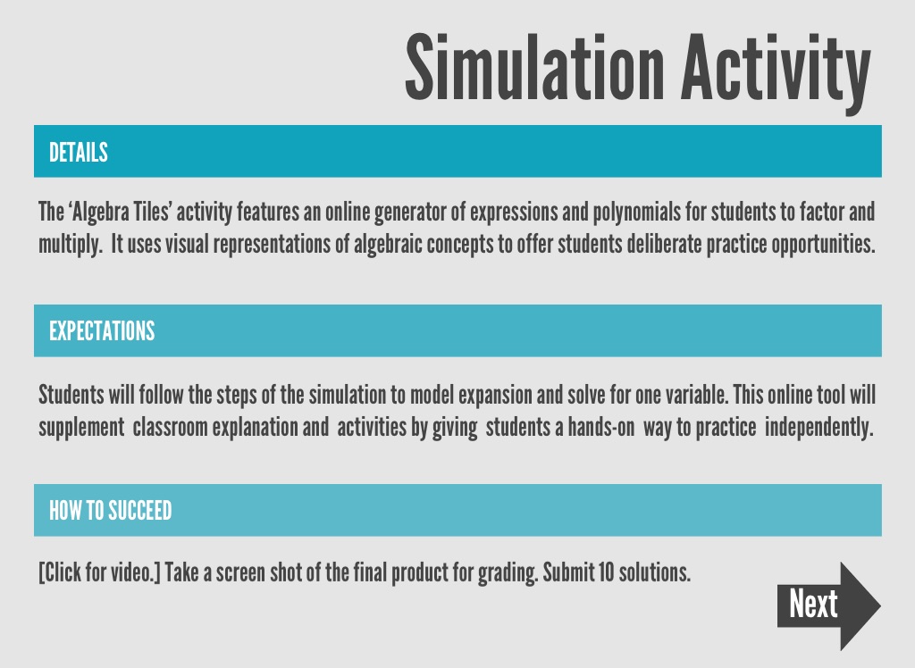 The ‘Algebra Tiles’ activity features an online generator of expressions and polynomials for students to factor and multiply. It uses visual representations of algebraic concepts to offer students deliberate practice opportunities.