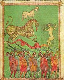 Beato de Osma. La victoria del cordero (escena del Apocalipsis) correspondiente al arte perrománico.