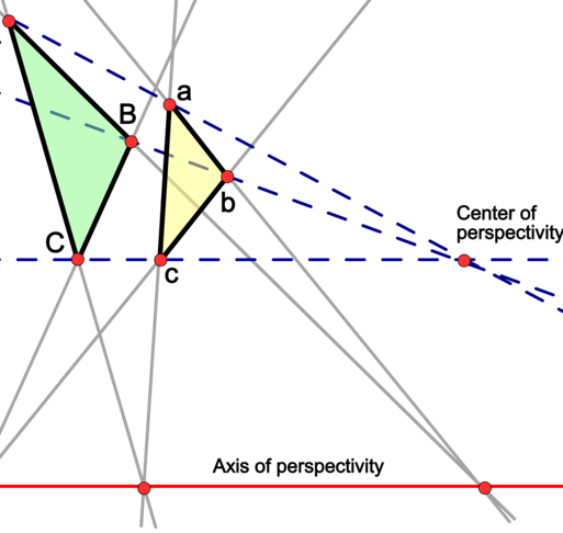 In 1636, Desargues produced his infamous "perspective theorem," which states, "When two triangles are in perspective, the points where the corresponding sides meet are collinear.”