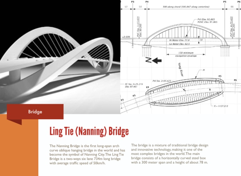 The Nanning Bridge is the first long-span arch curve oblique hanging bridge in the world and has become the symbol of Nanning City. The Ling Tie Bridge is a two-ways six lane 734m long bridge with average traffic speed of 50km/h.