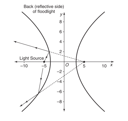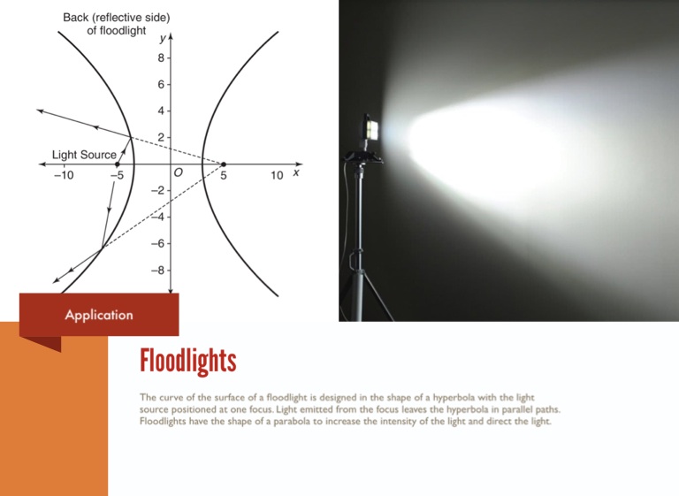 The curve of the surface of a floodlight is designed in the shape of a hyperbola with the light source positioned at one focus. Light emitted from the focus leaves the hyperbola in parallel paths. Floodlights have the shape of a parabola to increase the intensity of the light and direct the light.