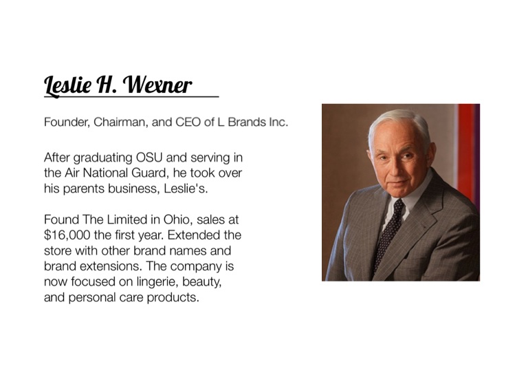 Found The Limited in Ohio, sales at $16,000 the first year. Extended the store with other brand names and brand extensions. The company is now focused on lingerie, beauty, and personal care products.