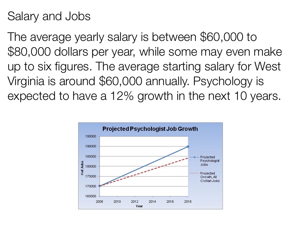 The average yearly salary is between $60,000 to $80,000 dollars per year, while some may even make up to six figures. The average starting salary for West Virginia is around $60,000 annually. Psychology is expected to have a 12% growth in the next 10 years.