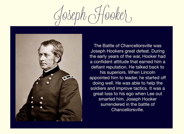 The Battle of Chancellorsville was Joseph Hookers great defeat. During the early years of the war, Hooker had a confident attitude that earned him a defiant reputation. He talked back to his superiors. When Lincoln appointed him to leader, he started off doing well. He was able to help the soldiers and improve tactics. It was a great loss to his ego when Lee out smarted him. Joseph Hooker surrendered in the battle of Chancellorsville.