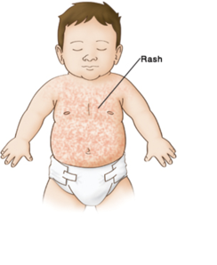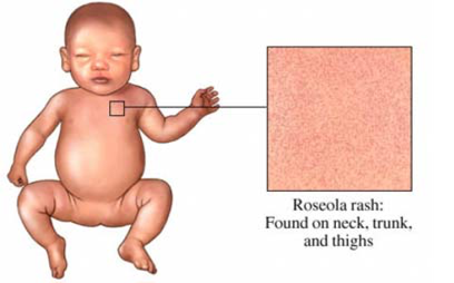 Roseola is caused by at least two viruses, herpes virus type 6 and possibly herpes virus type 7. These two diseases have just recently been discovered, so the full range of these diseases are unknown. Roseola is transmitted person to person brought respiratory fluids or saliva of an infected individual. It typically starts as a 3-5 day fever, which breaks abruptly, followed by a rash.