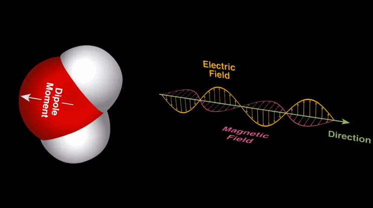 The waves twist the water molecules inside of your food. This causes friction leading to heat. The positively charged ends of the water molecules try to align with the electric field of the microwave oven.