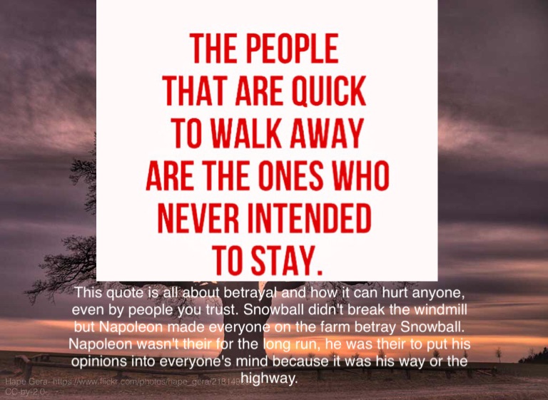This quote is all about betrayal and how it can hurt anyone, even by people you trust. Snowball didn't break the windmill but Napoleon made everyone on the farm betray Snowball. Napoleon wasn't their for the long run, he was their to put his opinions into everyone's mind because it was his way or the highway.