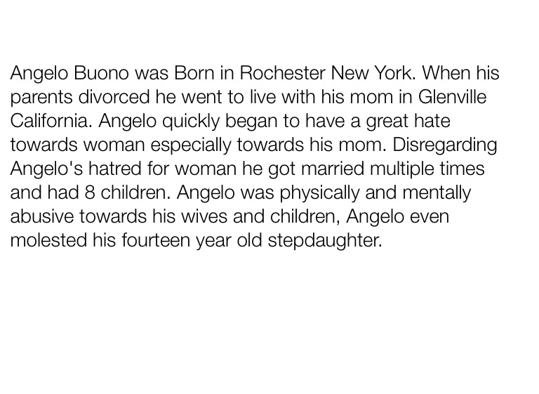 Angelo Buono was Born in Rochester New York. When his parents divorced he went to live with his mom in Glenville California. Angelo quickly began to have a great hate towards woman especially towards his mom. Disregarding Angelo's hatred for woman he got married multiple times and had 8 children. Angelo was physically and mentally abusive towards his wives and children, Angelo even molested his fourteen year old stepdaughter.