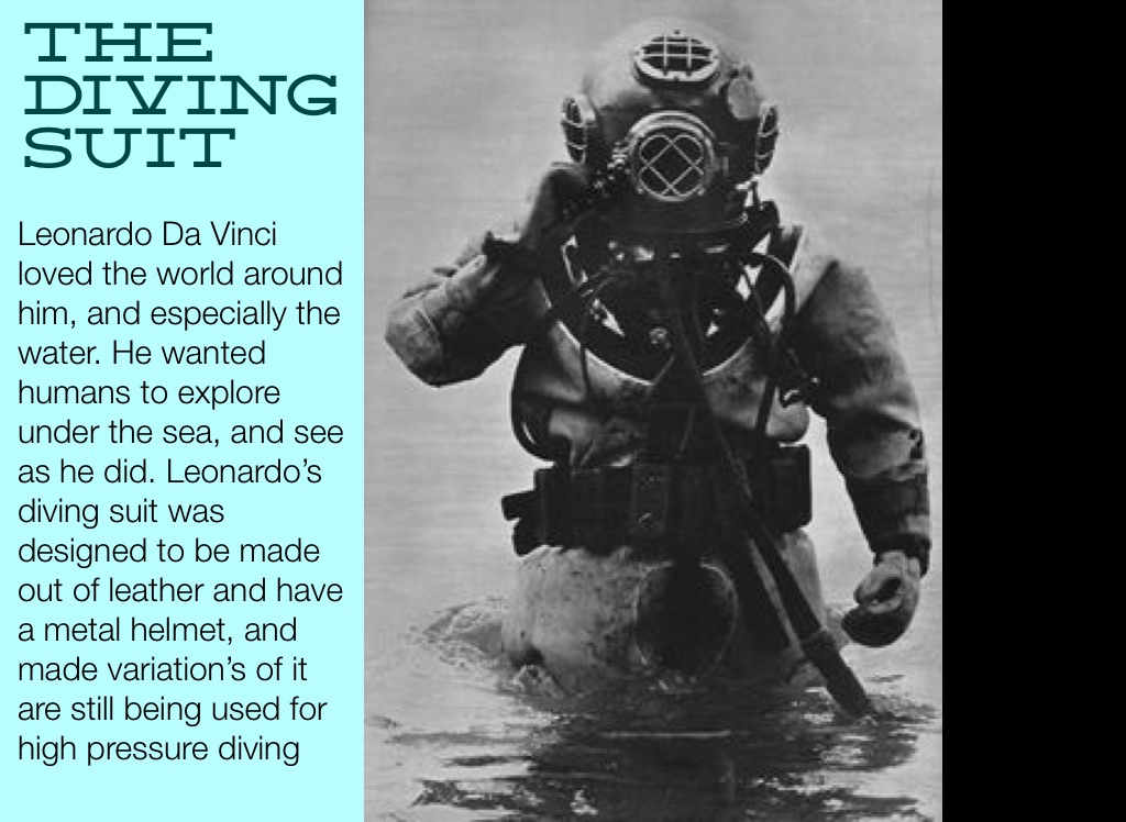 Leonardo Da Vinci loved the world around him, and especially the water. He wanted humans to explore under the sea, and see as he did. Leonardo’s diving suit was designed to be made out of leather and have a metal helmet, and made variation’s of it are still being used for high pressure diving