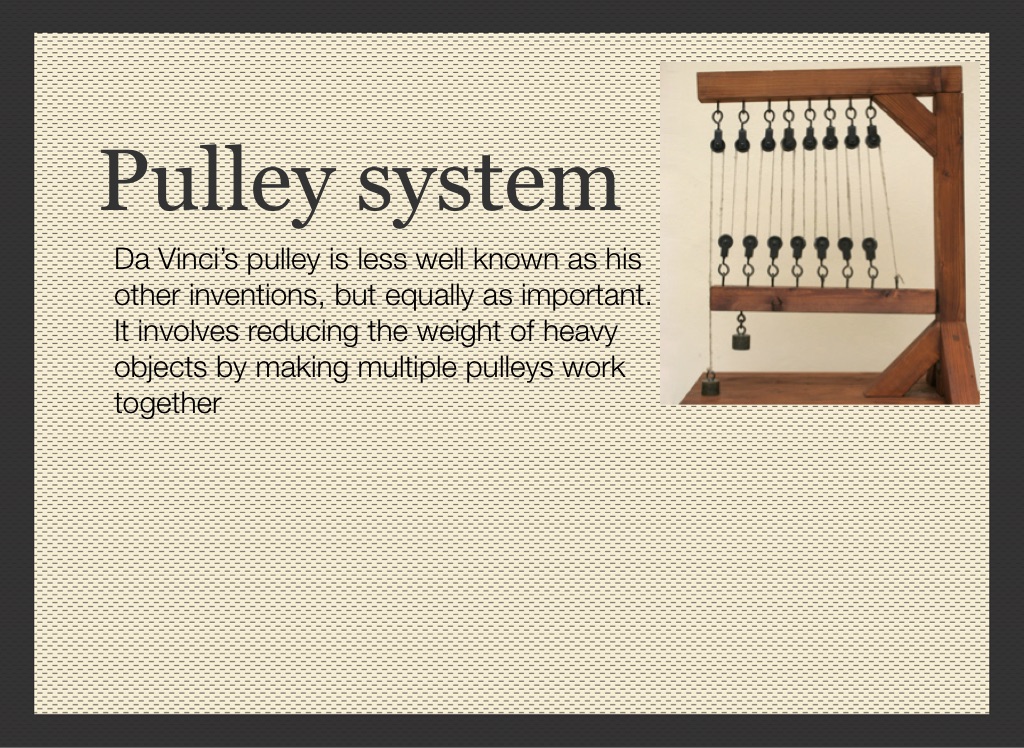 Da Vinci’s pulley is less well known as his other inventions, but equally as important. It involves reducing the weight of heavy objects by making multiple pulleys work together