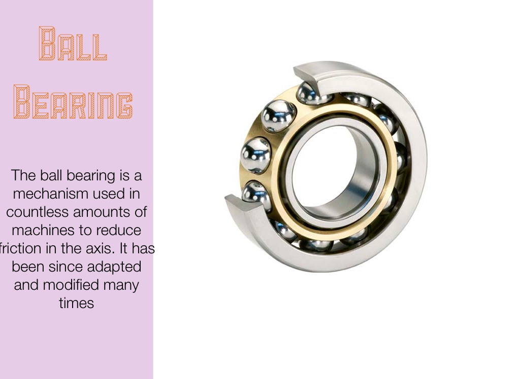 The ball bearing is a mechanism used in countless amounts of machines to reduce friction in the axis. It has been since adapted and modified many times