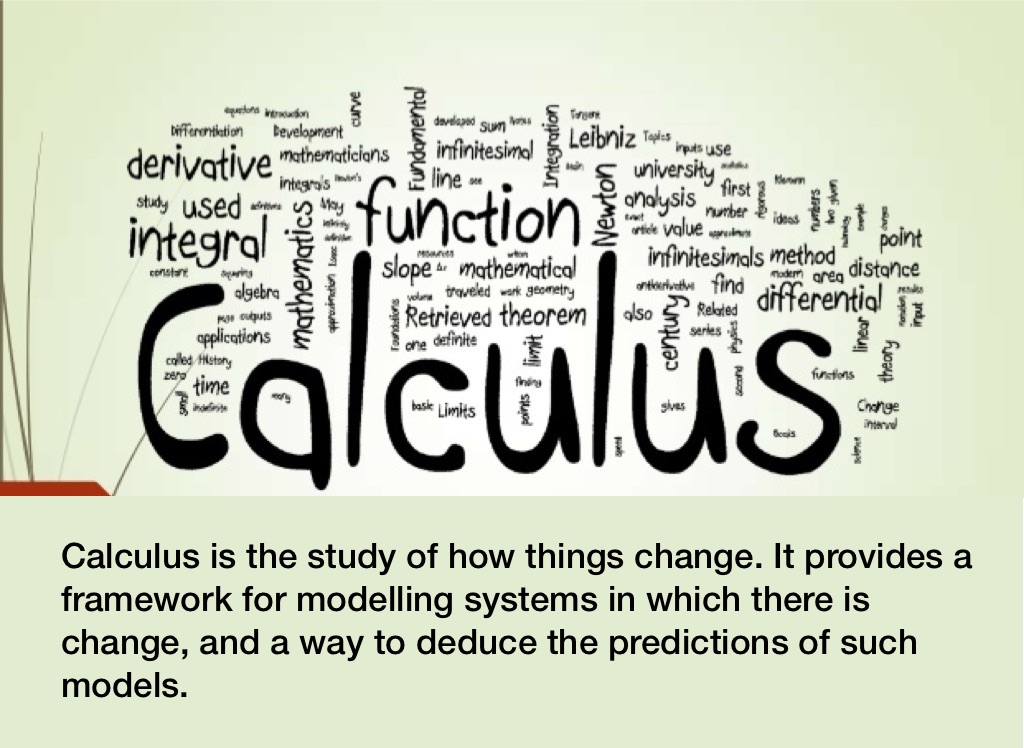 Calculus is the study of how things change. It provides a framework for modelling systems in which there is change, and a way to deduce the predictions of such models.