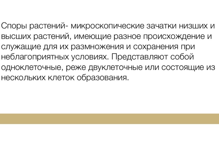 Споры растений- микроскопические зачатки низших и высших растений, имеющие разное происхождение и служащие для их размножения и сохранения при неблагоприятных условиях. Представляют собой одноклеточные, реже двуклеточные или состоящие из нескольких клеток образования.