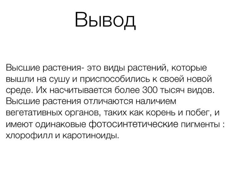 Высшие растения- это виды растений, которые вышли на сушу и приспособились к своей новой среде. Их насчитывается более 300 тысяч видов. Высшие растения отличаются наличием вегетативных органов, таких как корень и побег, и имеют одинаковые фотосинтетические пигменты : хлорофилл и каротиноиды.