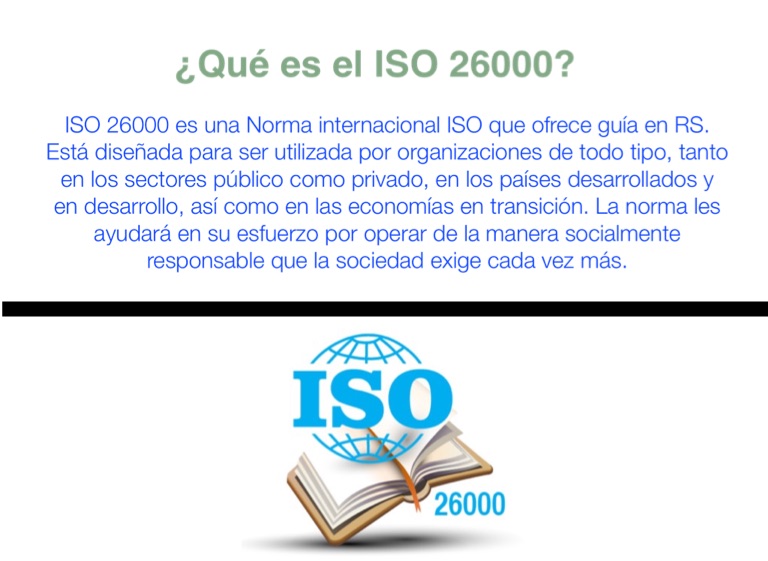 ISO 26000 es una Norma internacional ISO que ofrece guía en RS. Está diseñada para ser utilizada por organizaciones de todo tipo, tanto en los sectores público como privado, en los países desarrollados y en desarrollo, así como en las economías en transición. La norma les ayudará en su esfuerzo por operar de la manera socialmente responsable que la sociedad exige cada vez más.