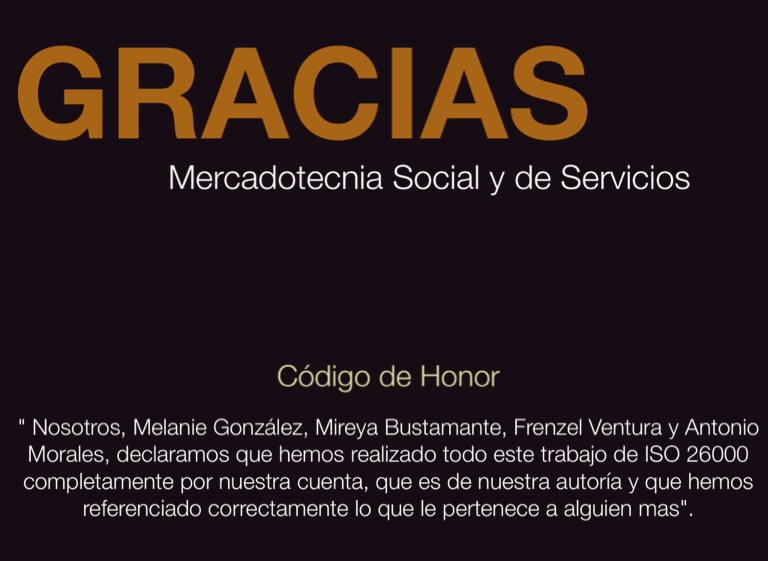 " Nosotros, Melanie González, Mireya Bustamante, Frenzel Ventura y Antonio Morales, declaramos que hemos realizado todo este trabajo de ISO 26000 completamente por nuestra cuenta, que es de nuestra autoría y que hemos referenciado correctamente lo que le pertenece a alguien mas".