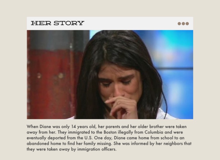 When Diane was only 14 years old, her parents and her older brother were taken away from her. They immigrated to the Boston illegally from Columbia and were eventually deported from the U.S. One day, Diane came home from school to an abandoned home to find her family missing. She was informed by her neighbors that they were taken away by immigration officers.