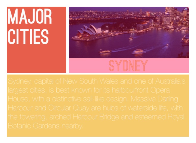 Sydney, capital of New South Wales and one of Australia's largest cities, is best known for its harbourfront Opera House, with a distinctive sail-like design. Massive Darling Harbour and Circular Quay are hubs of waterside life, with the towering, arched Harbour Bridge and esteemed Royal Botanic Gardens nearby.