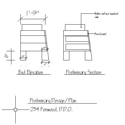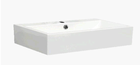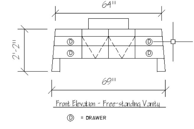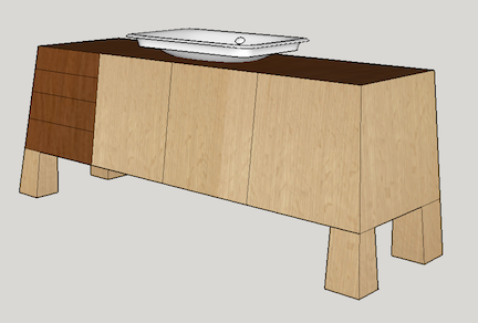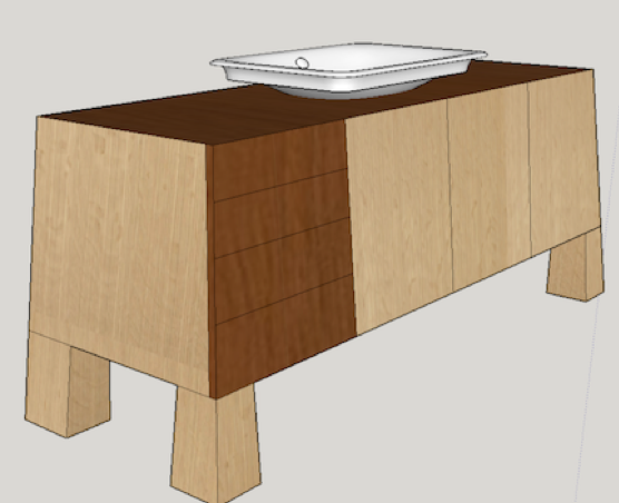 The vanity - sliced angular form with the trough sink (white) resting on its surface.