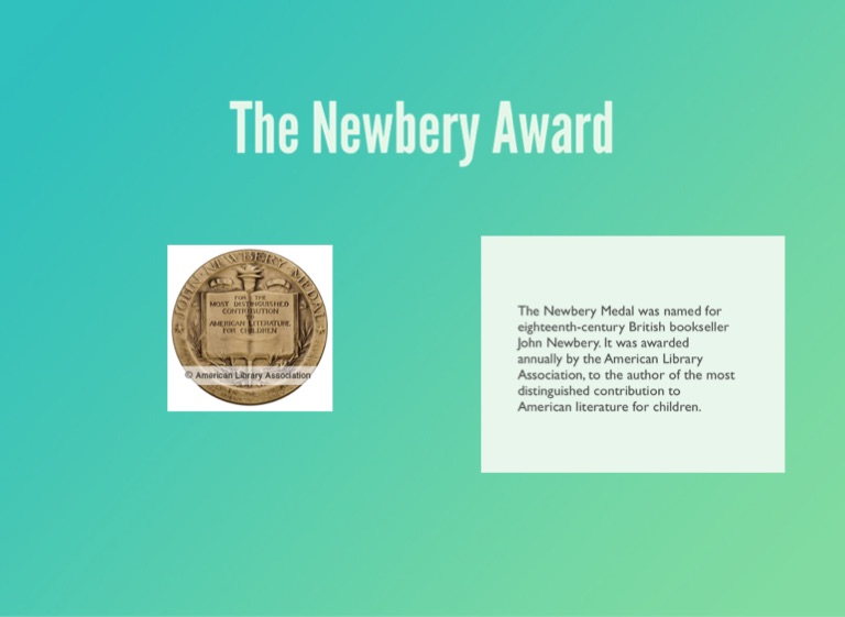 The Newbery Medal was named for eighteenth-century British bookseller John Newbery. It was awarded annually by the American Library Association, to the author of the most distinguished contribution to American literature for children.
