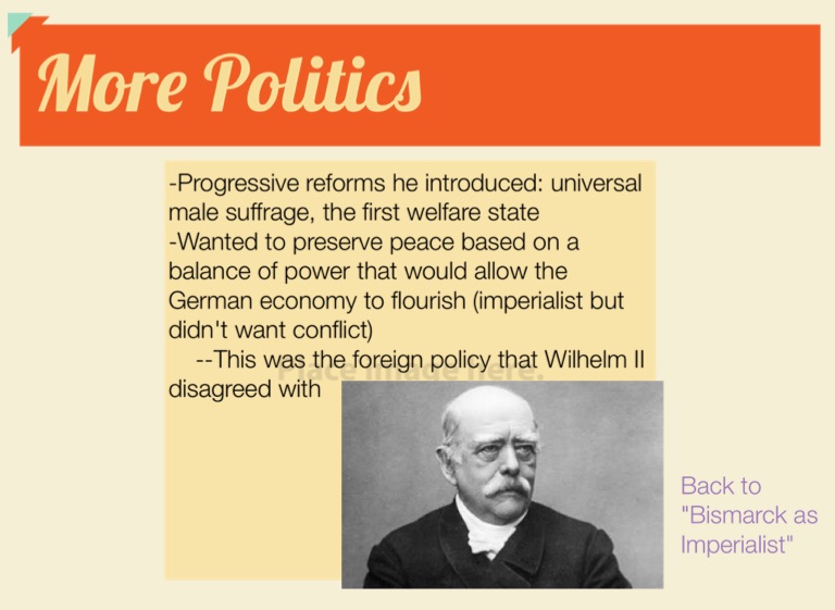-Wanted to preserve peace based on a balance of power that would allow the German economy to flourish (imperialist but didn't want conflict)