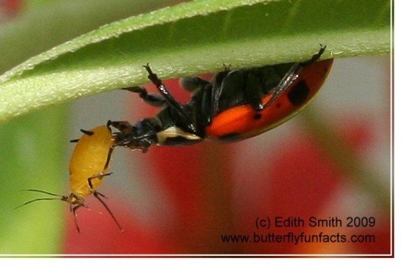 Ladybugs eat aphids, mites, beans, and melons. Birds eat