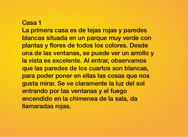 La primera casa es de tejas rojas y paredes blancas situada en un parque muy verde con plantas y flores de todos los colores. Desde una de las ventanas, se puede ver un arrollo y la vista es excelente. Al entrar, observamos que las paredes de los cuartos son blancas, para poder poner en ellas las cosas que nos gusta mirar. Se ve claramente la luz del sol entrando por las ventanas y el fuego encendido en la chimenea de la sala, da llamaradas rojas.