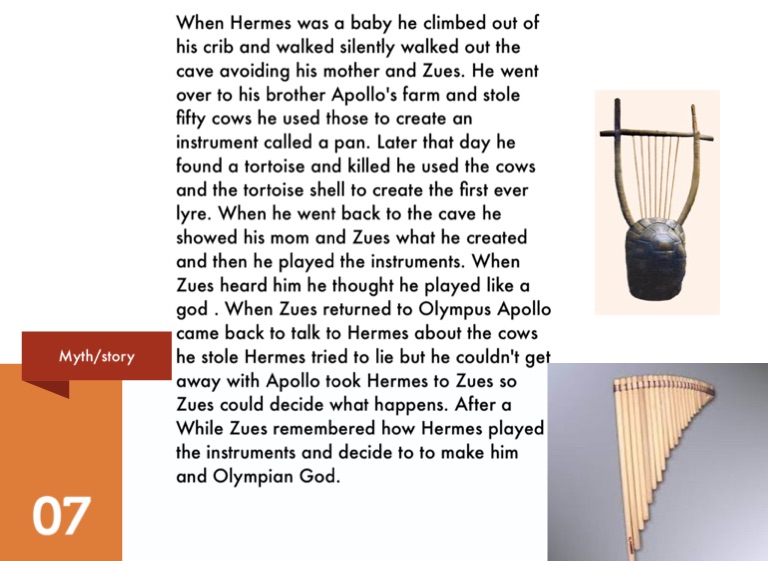 When Hermes was a baby he climbed out of his crib and walked silently walked out the cave avoiding his mother and Zues. He went over to his brother Apollo's farm and stole fifty cows he used those to create an instrument called a pan. Later that day he found a tortoise and killed he used the cows and the tortoise shell to create the first ever lyre. When he went back to the cave he showed his mom and Zues what he created and then he played the instruments. When Zues heard him he thought he played like a god . When Zues returned to Olympus Apollo came back to talk to Hermes about the cows he stole Hermes tried to lie but he couldn't get away with Apollo took Hermes to Zues so Zues could decide what happens. After a While Zues remembered how Hermes played the instruments and decide to to make him and Olympian God.