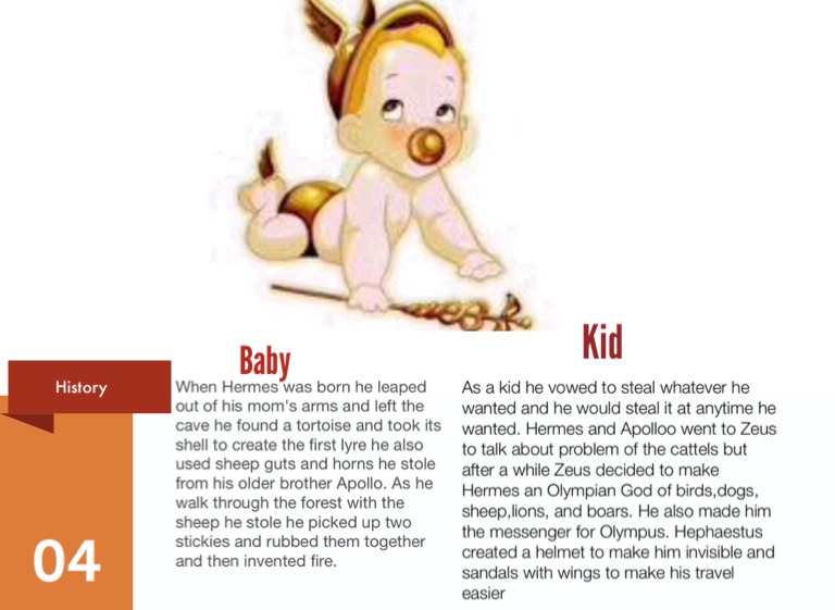 As a kid he vowed to steal whatever he wanted and he would steal it at anytime he wanted. Hermes and Apolloo went to Zeus to talk about problem of the cattels but after a while Zeus decided to make Hermes an Olympian God of birds,dogs, sheep,lions, and boars. He also made him the messenger for Olympus. Hephaestus created a helmet to make him invisible and sandals with wings to make his travel easier