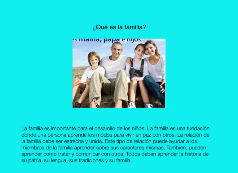La familia es importante para el desarollo de los niños. La familia es una fundación donde una persona aprende los modos para vivir en paz con otros. La relación de la familia debe ser estrecha y unida. Este tipo de relación puede ayudar a los miembros de la familia aprender sobre sus caracteres mismas. También, pueden aprender como tratar y comunicar con otros. Todos deben aprender la historia de su patria, su lengua, sus tradiciones y su familia.