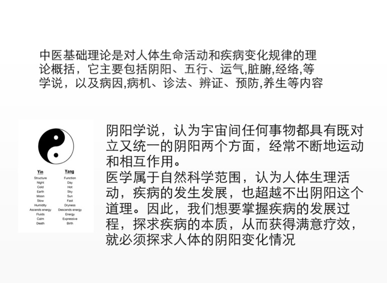 中医基础理论是对人体生命活动和疾病变化规律的理论概括,它主要包括阴阳、五行、运气,脏腑,经络,等学说,以及病因,病机、诊法、辨证、预防,养生等内容