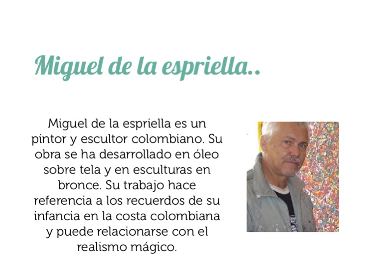 Miguel de la espriella es un pintor y escultor colombiano. Su obra se ha desarrollado en óleo sobre tela y en esculturas en bronce. Su trabajo hace referencia a los recuerdos de su infancia en la costa colombiana y puede relacionarse con el realismo mágico.