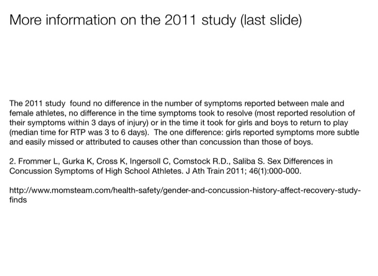 The 2011 study found no difference in the number of symptoms reported between male and female athletes, no difference in the time symptoms took to resolve (most reported resolution of their symptoms within 3 days of injury) or in the time it took for girls and boys to return to play (median time for RTP was 3 to 6 days). The one difference: girls reported symptoms more subtle and easily missed or attributed to causes other than concussion than those of boys.